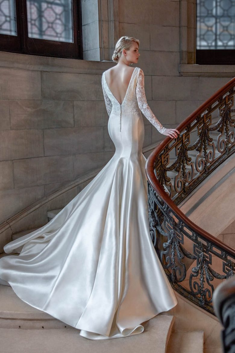 素肌に浮き立つレース、豪華なロングトレーンが